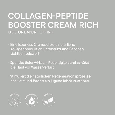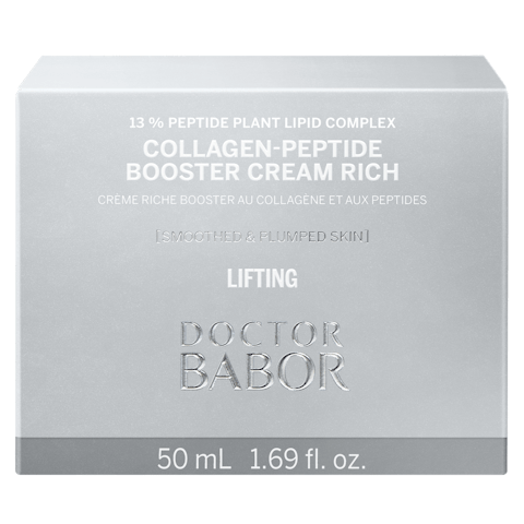 Das Herzstück jeder BABOR Formel sind sichtbare Ergebnisse. Die DOCTOR BABOR LIFTING Collagen-Peptide Booster Cream Rich, der Nachfolger der Collagen Booster Cream Rich, unterstützt reduziert mit einem innovativen 13% Peptide Plant Lipid Komplex mit u.a. Peptiden und Pflanzenstoffen die die hauteigene Kollagenproduktion und reduziert die Faltentiefe. Natürliche Squalane, Sheabutter und wertvolles Öl binden Feuchtigkeit bis tief in die Haut und schützen vor transepidermalem Wasserverlust. Morgens und abends angewendet, erstrahlt die Haut wie verjüngt durch gemilderte Linien und Fältchen. Angereichert mit dem DOCTOR BABOR exklusiven BIOGEN PLANT EXTRAKT, die Krönung der Babor Forschung, werden die hauteigenen Regenerationsprozesse angeregt und somit die jugendliche Agilität der Haut gefördert.