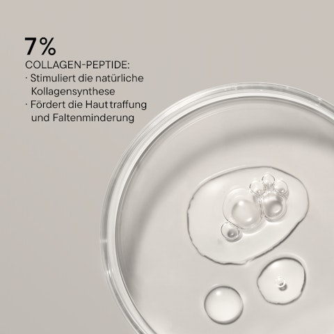Die Kombination von molekularen Hexapeptiden, Polypeptiden und Tetrapeptide-72 unterstützen an unterschiedlichen Rezeptoren den Prozess der Kollagensynthese. Das Kollagen-Typ-1 ist die wichtigste Kollagenart in der Haut und sorgt in der extrazellulären Matrix sowohl für Festigkeit als auch die Elastizität der Haut. Falten und feine Linien sind unter anderem ein Zeichen einer nachlassenden Kollagenkonzentration. Die hocheffektive Zusammenstellung dieser Peptide verbessert die Elastizität und Dichte der Haut und reduziert die nachlassende Gewebefestigkeit. Die Haut sieht deutlich straffer aus. Die Konturen werden fester und der Teint wirkt praller, glatter und gleichmäßiger.