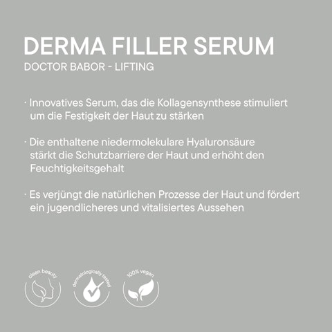 100% vegan und frei von Silikonen, Parabenen, Mineralölen, PEGs, Mikroplastik und anderen unnötigen Inhaltsstoffen wurde das Derma Filler Serum nach den ambitionierten BABOR Richtlinien für cleane Formeln von den BABOR Experten in den unternehmenseigenen Laboratorien in Aachen, Deutschland, entwickelt und perfektioniert. Made in Germany ist ein Qualitätssiegel, welches für dieses Produkt und das ganze Unternehmen steht.