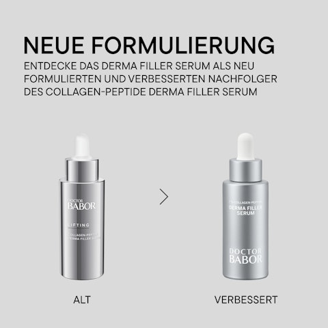 Das Herzstück jeder BABOR Formel sind sichtbare Ergebnisse. Das Derma Filler Serum, der Nachfolger des Collagen-Peptide Derma Filler Serums, mit 7% Collagen-Peptide Komplex aus Peptiden und Pflanzenstoffen stimulieren die Kollagensynthese und helfen das gesamte Spektrum der vier Kollagenfamilien zu triggern für ein strafferes und gestärktes Hautbild.