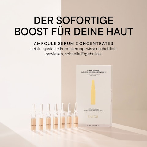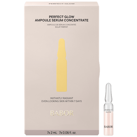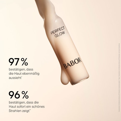 Die Wirkstoffe der Perfect Glow Ampoule Concentrates verhelfen zu einem gleichmäßigeren Hautton. Die Haut wirkt zudem glatter, rosig frisch, und strahlt.